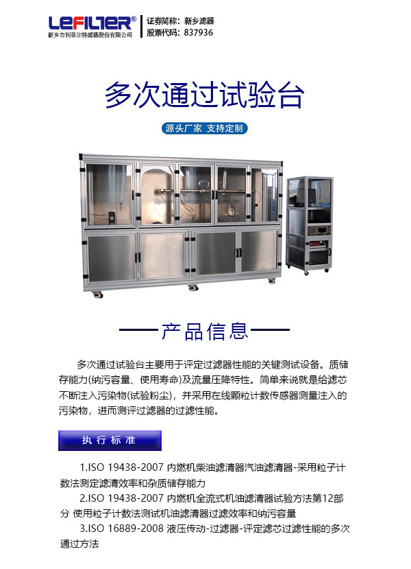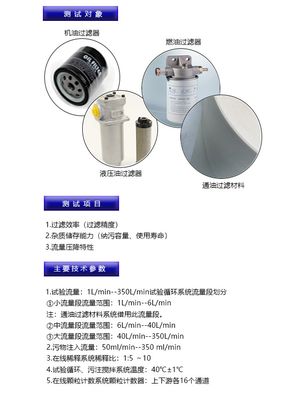 多次通過試驗臺主要用于評定過濾器性能的關鍵測試設備。質儲存能力(納污容量、使用壽命)及流量壓降特性。簡單來說就是給濾芯不斷注入污染物(試驗粉塵),并采用在線顆粒計數傳感器測量注入的污染物,進而測評過濾